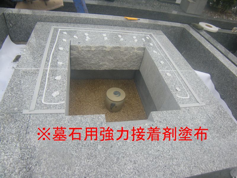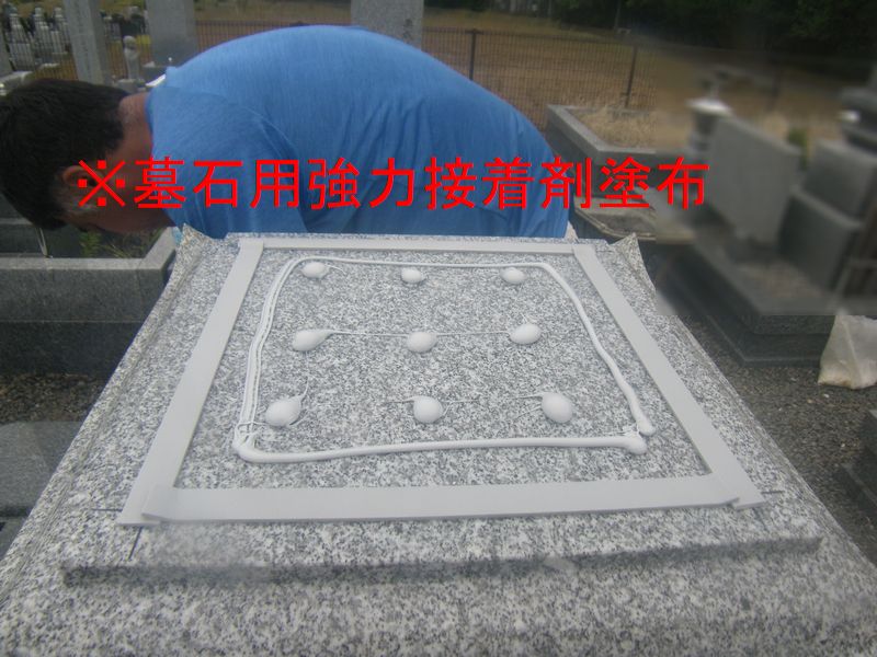 同じく墓石用協力接着剤を塗布し据え付けていきます。