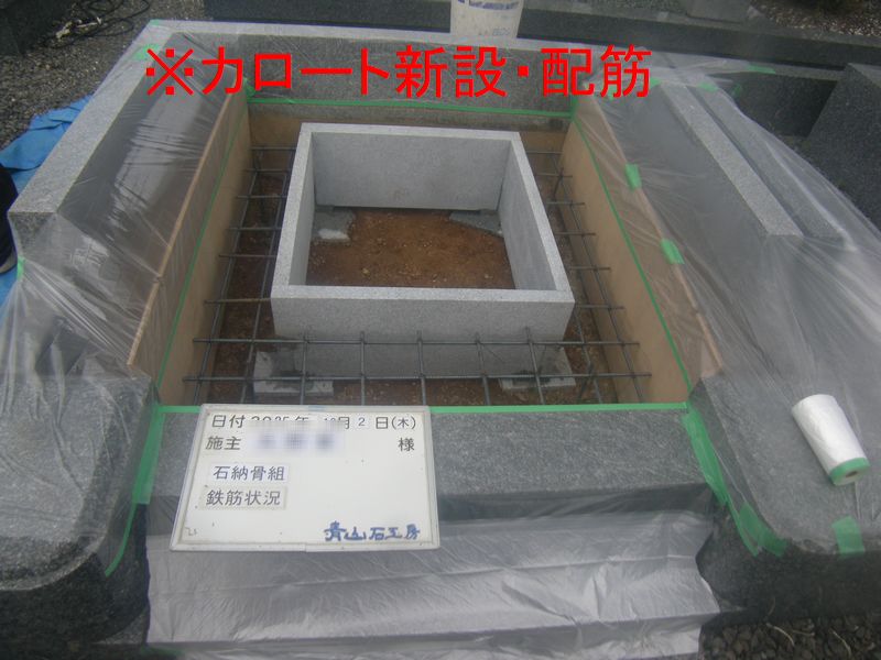 土台の中の土を出し、石組納骨室を組んでから配筋をしました。