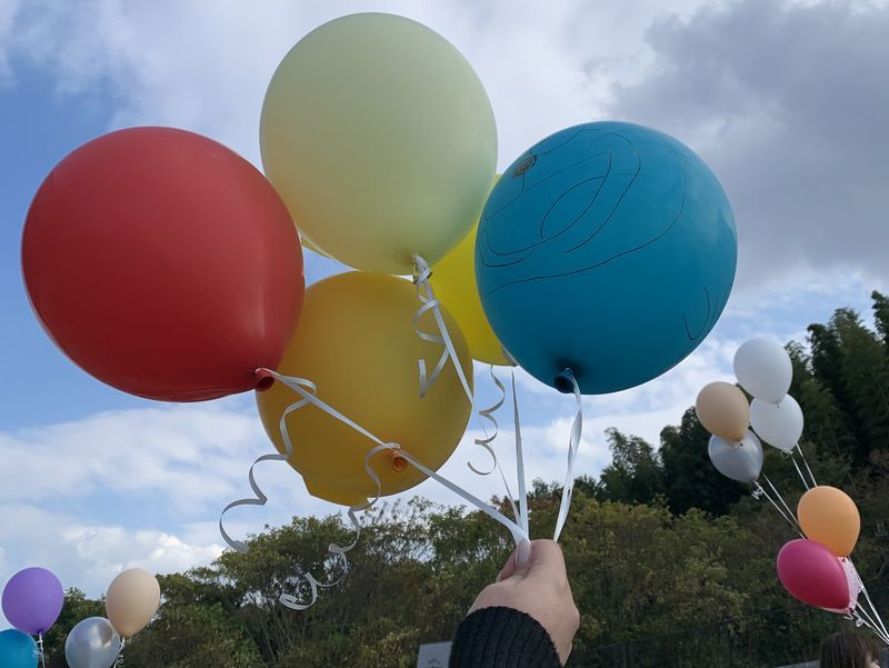 心を込めて書かれたメッセージは、色とりどりのバルーンに結びつけて空へ放ちました。