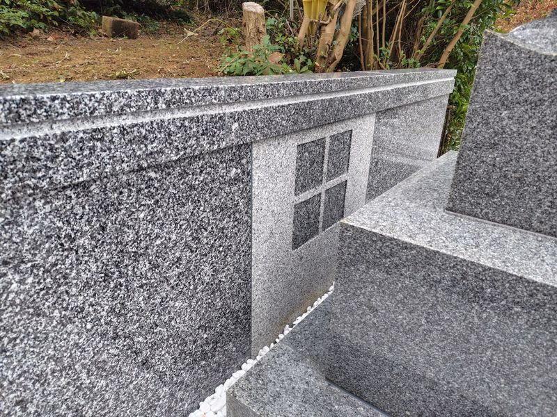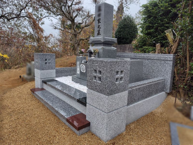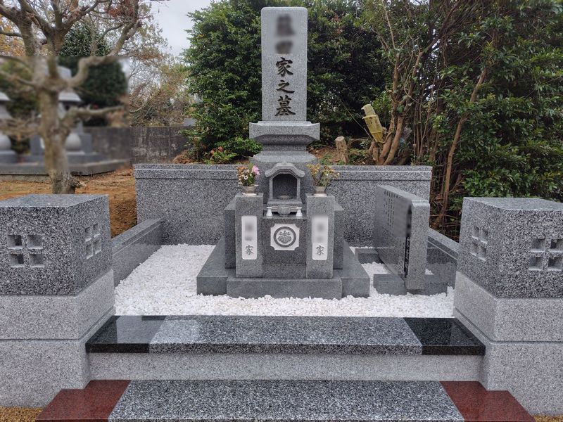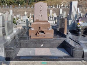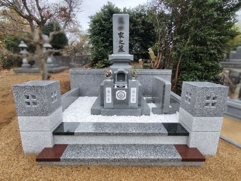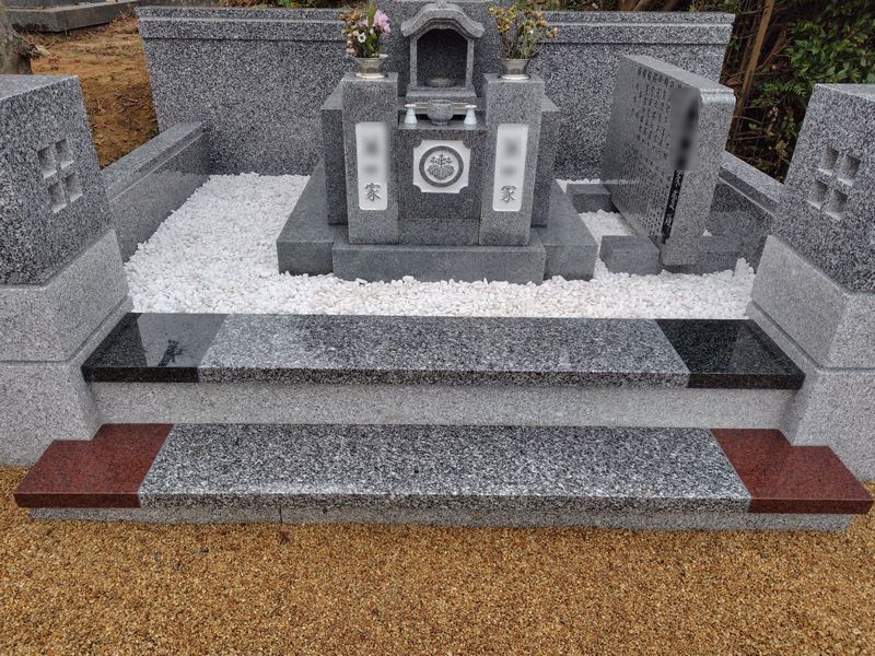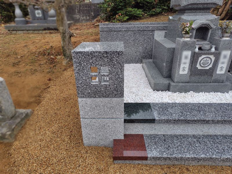 両側に緑と赤の御影石を配置することで、墓所全体が明るく上品な雰囲気に仕上がっています。