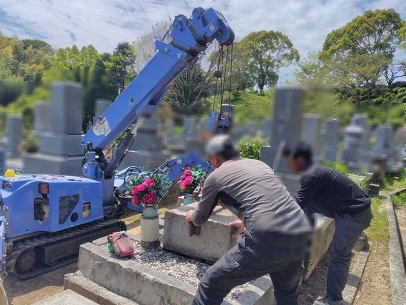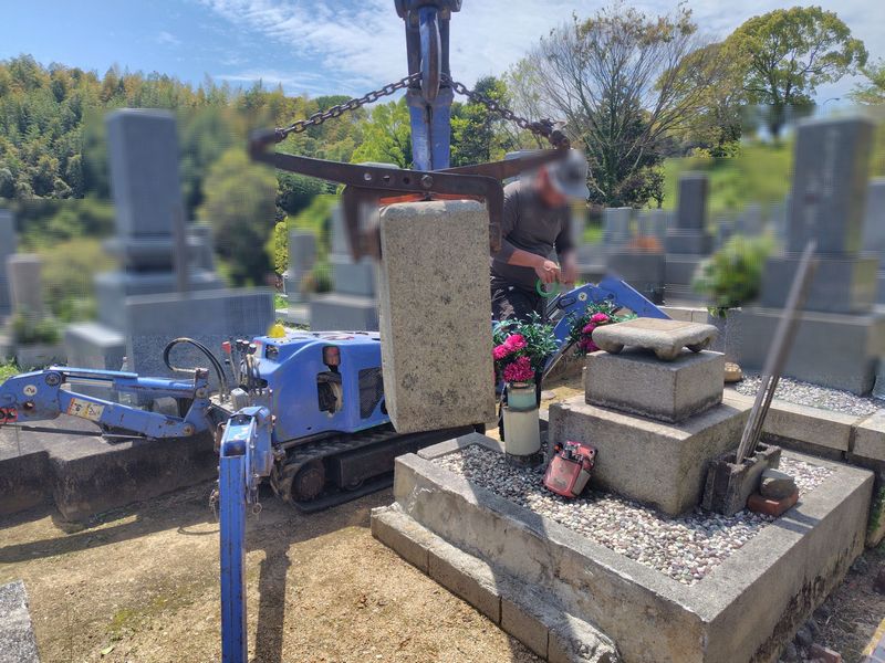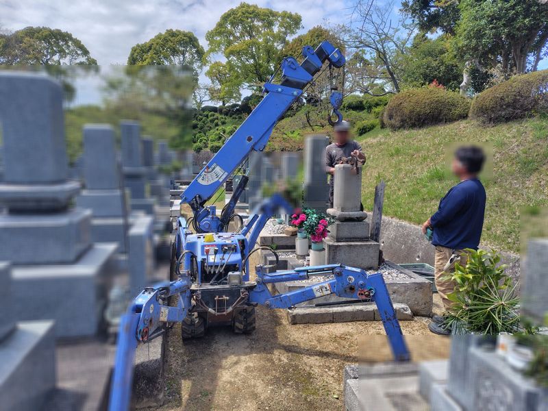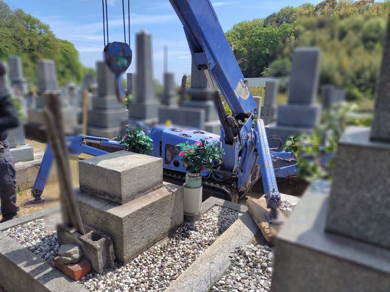 墓石本体は重量があるため、解体作業には小型移動式クレーンを使用しました。