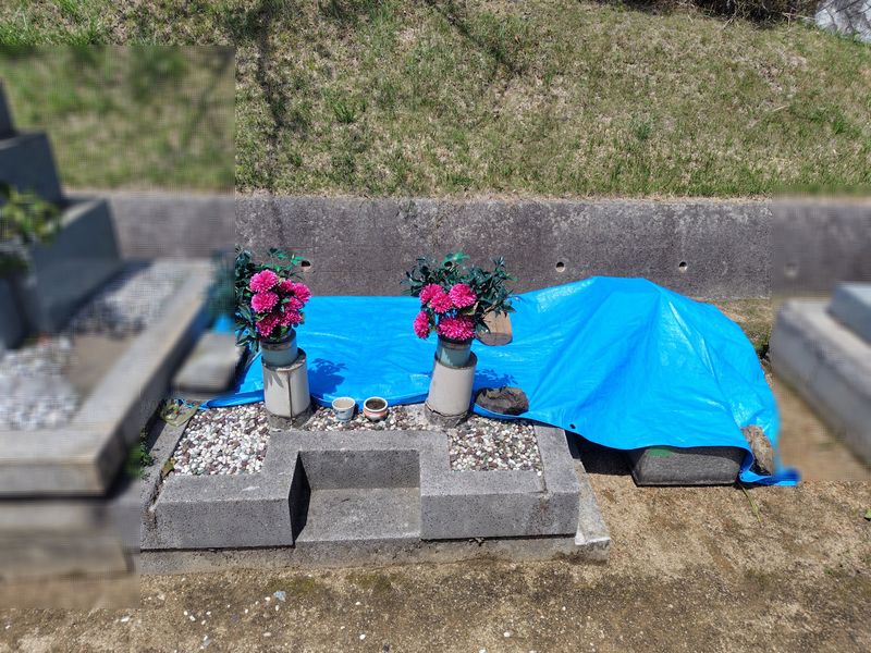 納骨式の日まで、納骨室や墓石が濡れたり汚れたりしないよう、ブルーシートで養生をさせていただきました。